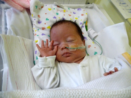 Monica sunbathing blissfully oblivious to the snow and chaos outside. We had to stay in a hotel nearby the hospital to ensure the little ones milk supply route was kept open.