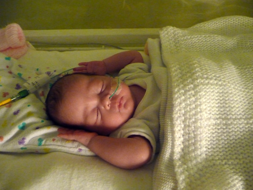 One of the first reactions of the doctors to Monica's desaturations was to recommend more blood tests but Marie managed to stall them on that and requested that they wait until tomorrow to see if Monica improves overnight. Unfortunately though, Monica is now back on Oxygen with tubes running to her nose. Mum said she exhibited quite a level of annoyance at this and promptly tried to rip both the oxygen and feeding tubes off and very nearly succeeded. She had to have a pair of mittens on for her own sake although I'm not sure she understands where her beautiful hands have gone as she did look a little puzzled at times. On the plus side though, today's events didn't seem to put her off her milk too much :-) (although it did take a lot longer to feed her than normal).